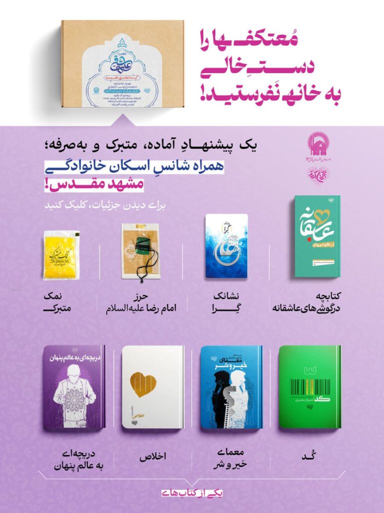 ✨ مدیران و سرپرستان اعتکافها میتوانند با تخفیف ویژه، از این امکانِ موسسه جوانان آستان قدس رضوی استفاده کنند و با تهیۀ بسته اعتکاف، این هدیۀ امامرضایی، یک آگاهیبخشیِ دینیِ حرفهای، بهیادماندنی و چشمنواز برای مخاطبان خود تدارک ببینند.